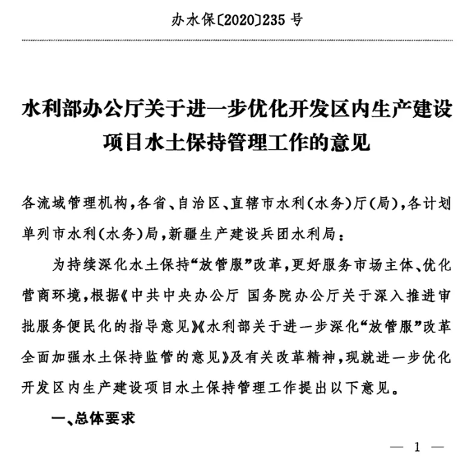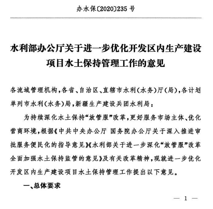 水利部辦公廳發(fā)布:辦水保[2020]235號(hào)文件關(guān)于進(jìn)一步優(yōu)化開(kāi)發(fā)區(qū)內(nèi)生產(chǎn)建設(shè)項(xiàng)目水土保持管理工作的意見(jiàn)