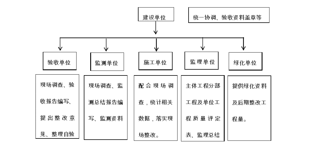 水土保持設(shè)施驗收工作主要工作內(nèi)容包括現(xiàn)場調(diào)查、資料收集及整理、報告編寫三個部分。驗收組織框架及單位任務(wù)見下圖: